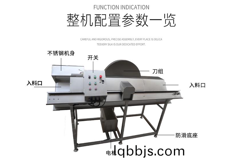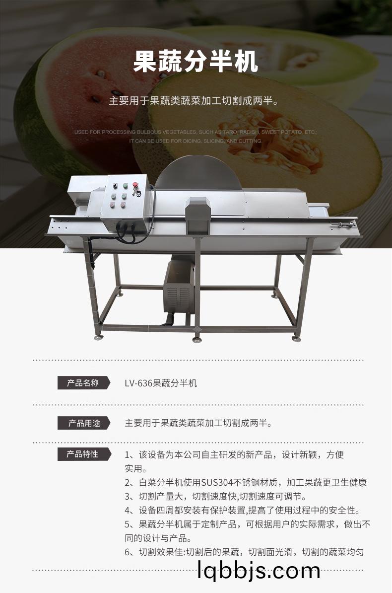 产品简介:主要用于果蔬类蔬菜加工切割成两半。特性:1、该设备为本公司自主研发的新产品,设计新颖,方便实用。2、白菜分半机使用SUS304不锈钢材质,加工果蔬更卫生健康3、切割产量大,切割速度快,切割速度可调节。4、设备四周都安装有保护装置,提高了使用过程中的安全性。5、果蔬分半机属于定制产品,可根据用户的实际需求,做出不同的设计与产品。6、切割效果佳:切割后的果蔬,切割面光滑,切割的蔬菜均匀。