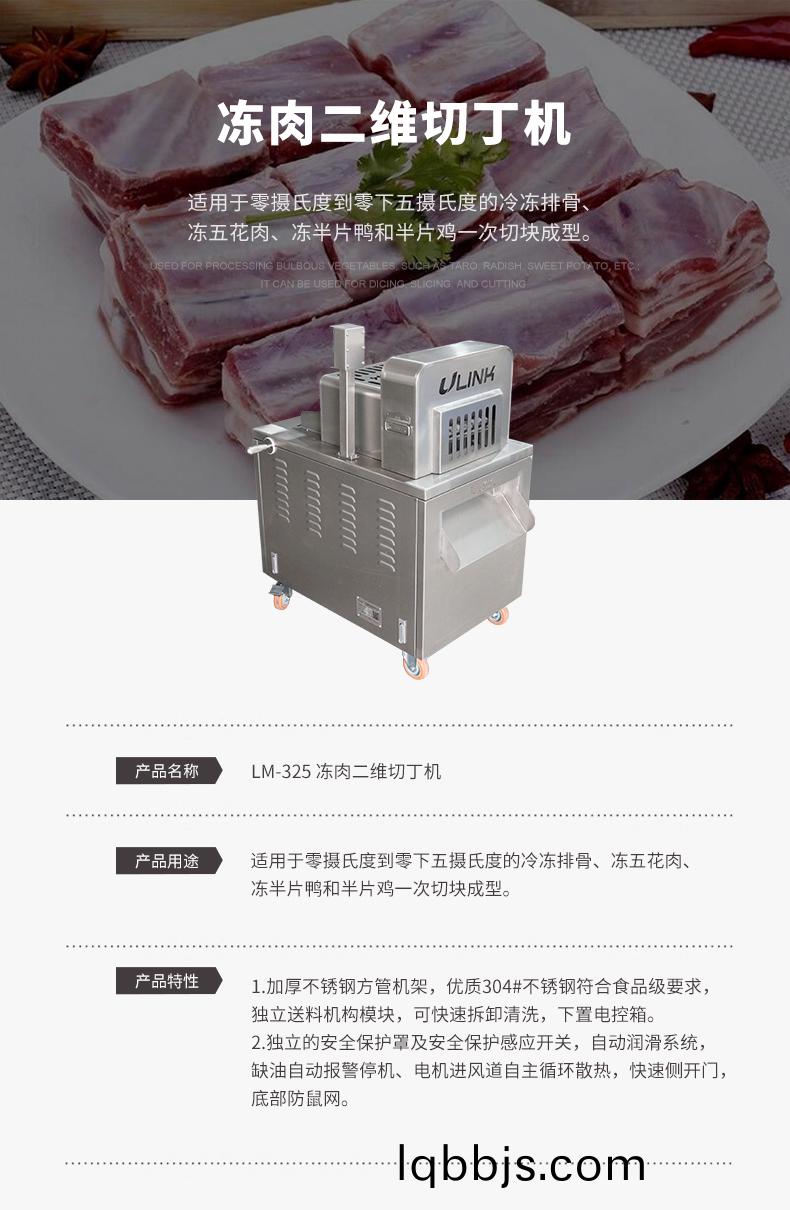 适用于零摄氏度到零下五摄氏度的冷冻排骨、冻五花肉、冻半片鸭和半片鸡一次切块成型。