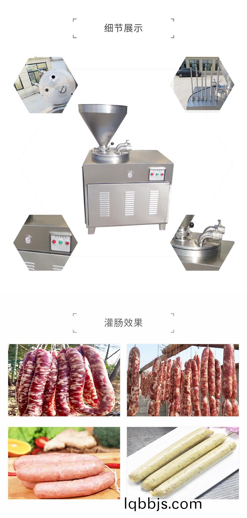 用途:用各种畜禽类肉糜为原料,可以灌制扭结定重量单肠,也可连续灌制长肠,单肠重量在50-1000克之间,有刻度连续可调,定量准确,误差<2%。适用于中小型肉类加工厂。特性:1.采用国内先进技术,设计合理,结构紧凑,使用SuS304不锈钢制造,符合食品卫生级要求。2.操作方便,调整简单,只需1人操作。3.连续作业,加料时不需停机,生产效率高。