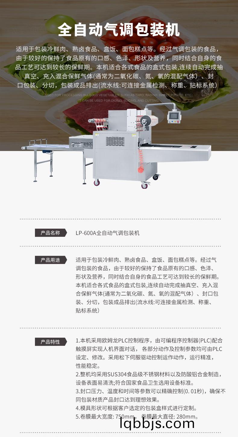 适用于包装冷鲜肉、熟卤食品、盒饭、面包糕点等。经过气调包装的食品,由于较好的保持了食品原有的口感、色泽、形状及营养,同时结合自身的食品工艺可达到较长的保鲜期。本机适合各式食品的盒式包装,连续自动完成抽真空、充入混合保鲜气体(通常为二氧化碳、氮、氧的混配气体)、封口包装、分切,包装成品排出(流水线:可连接金属检测、称重、贴标系统)